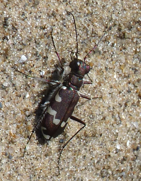 Llun uchaf: Mae chwilen deigr y twyni Cicindela maritima yn bresyliwr anfynych ar gyn-dwyni Cymru a Lloegr, gyda nifer o safleoedd yng Nghymru – gan gynnwys Morfa Dyffryn a Whiteford – yn cynnal poblogaethau cryf.