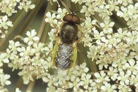 Llun gwaelod: Dengys y ddelwedd Odontomyia hydroleon (Pryf Soldiwr) – pryf prin nas ceir ond yn nwy safle yn y Deyrnas Unedig. Y sgydau dŵr tra fasig yn SoDdGA Banc y Mwldan yng Ngheredigion yw’r unig fan yng Nghymru lle ceir y rhywogaeth hon.