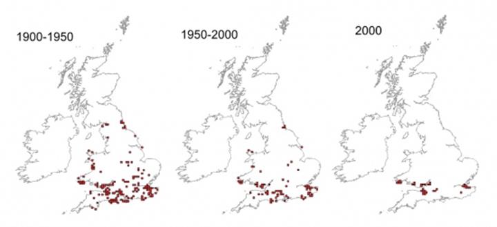 Maps showing the UK distribution of the Shrill carder bee. Maps courtesy of Bees Wasps & Ants Recording Society (BWARS)